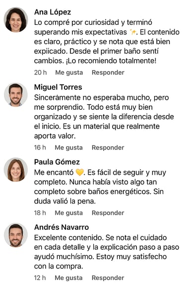 Este sistema ha ayudado a más de 3.000 personas y ahora tú también puedes formar parte de este equipo de personas prósperas con autoestima y amor propio. Si no ves una diferencia en tu vida con los baños en 7 días, te devolvemos el dinero, sin preguntas.